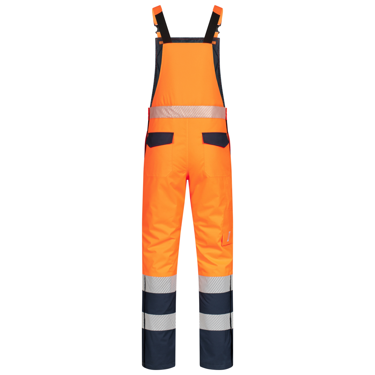 Besondere Merkmale umfassen wind- und wasserabweisende Eigenschaften dank verschweißter Nähte sowie eine Wassersäule von über 1.300 mmH2O. Umlaufende segmentierte Reflexelemente an Bund und Beinabschlüssen sorgen für optimale Sichtbarkeit, insbesondere in Kombination mit der Jacke 7179. Praktische Details wie anpassbarer Bund mit Knöpfen, verstärkte Taschen (Gesäß-, Seiten-, Zollstock- und Latztasche mit Smartphone- und Stifthalter), stabile Clipverschlüsse und elastische Träger erhöhen die Funktionalität.