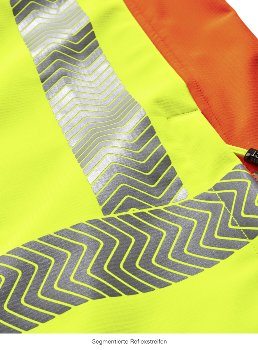 • Neuartige, segmentierte Reflexstreifen, die direkt aufgeprintet werden, umlaufen Körper und Ärmel sowie die Schulterpartien (Hosenträgerreflexstreifen).